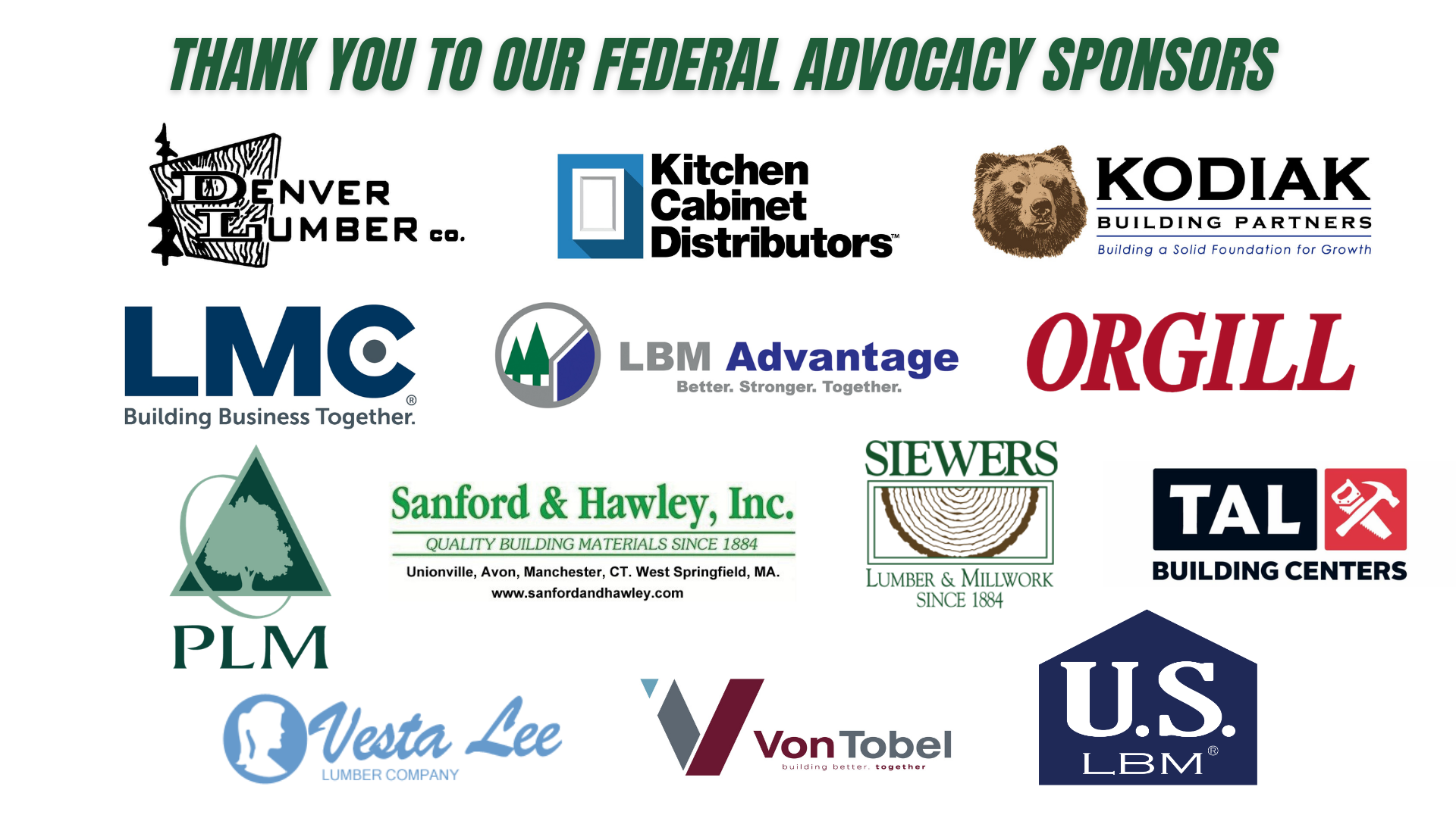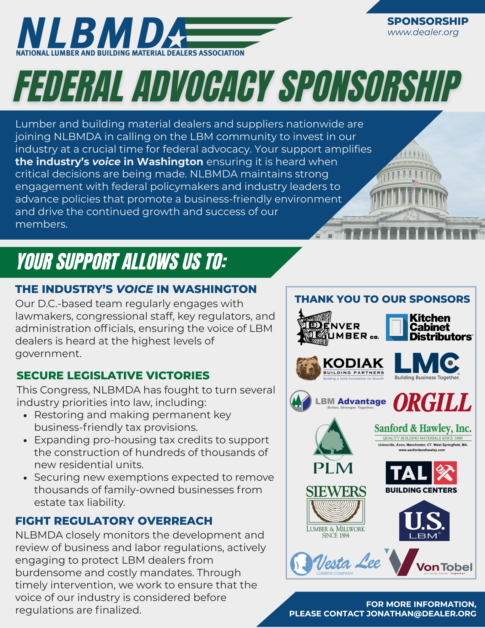 NLBMDA’s federal advocacy is your first line of defense against rising costs, unnecessary regulations, and threats to your bottom line. By becoming a Federal Advocacy Sponsor, you’re not just supporting policy work — you’re making a strategic investment in the future of the LBM industry. Our team is in Washington every day, working directly with lawmakers and regulators to ensure the LBM industry’s voice is heard. Recent wins include permanent small business tax relief, expanded estate tax exemptions, and the passage of some of the most pro-housing tax policies in over a decade — victories made possible by sponsors like you. As a Federal Advocacy Sponsor, you help shape the future of our industry. Your support strengthens our influence, raises our visibility, and secures the LBM industry's seat at the table when critical decisions are made. Join us in championing the priorities of LBM dealers nationwide — and ensure your interests are front and center in Washington’s most important policy discussions. For more information, please contact [email protected] READ MORELEARN MORE ABOUT OUR LEGISLATIVE PRIORITIES |